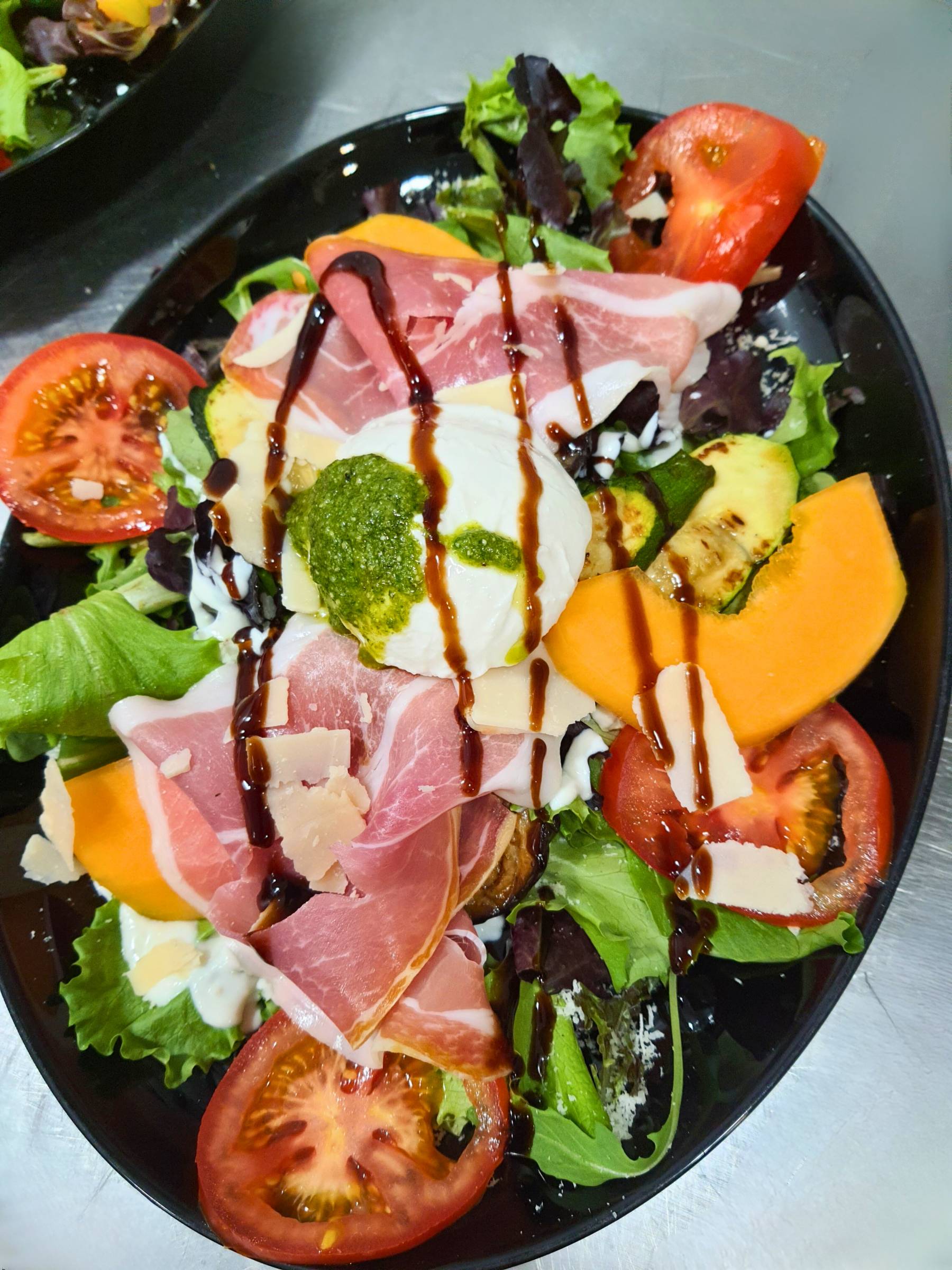 Salade Italienne : Salade, Jambon cru, Burrata truffé, Copeaux de parmesan, Melon, Croûtons, Tomate 21€