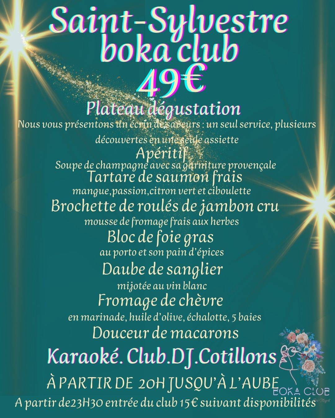 Cette année, le Boka Club innove pour vos papilles ! Nous vous proposons notre formule exclusive à 49€ : l'Écrin de Saveurs. Oubliez les longs repas à multiples services ; nous vous offrons un concept de plateau de dégustation unique, généreux et varié. En un seul service élégant, vous voyagerez à travers une collection de mets fins et festifs. De l'apéritif pétillant, en passant par notre Tartare de Saumon Mangue-Passion ultra-frais, le délicat Bloc de Foie Gras, notre savoureuse Daube de Sanglier mijotée, les fromages affinés et la douceur finale des Macarons – tout est réuni pour une expérience gastronomique complète et excitante. C'est l'assurance de déguster une multitude de délices sans les contraintes d'un menu traditionnel.