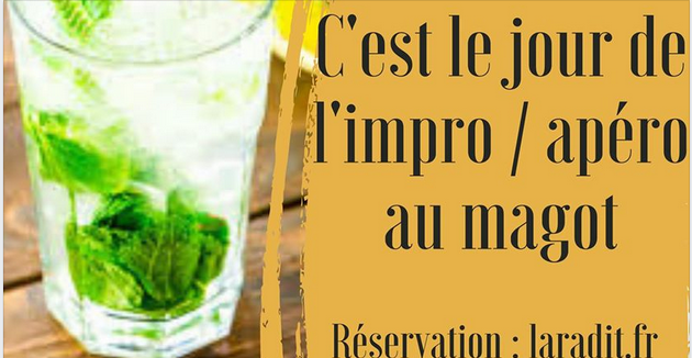 Vous ne connaissez pas encore les spectacles de la troupe de La Radit ? Venez, Jeudi 28 novembre à Toulon près de La Garde au club bar Le Magot et découvrez un spectacle délirant. Ces amateurs passionnés de théâtre, mettent en scène tout leur talent. Selon un thème donné en tournant la roue ou par une personne du public, assistez à de vrais duels d'improvisation et décidez quelle est la meilleure équipe. Pour vous amuser tout en mangeant, le club bar restaurant Le Magot vous propose une formule bruschetta à 13,50€, un petit prix pour un grand spectacle.